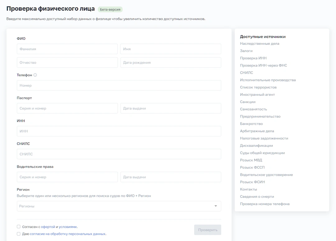 Сервис собирает информацию из более чем 15 источников для формирования полного отчета о физическом лице, что критически важно при найме на ответственные должности или работе с ИП.