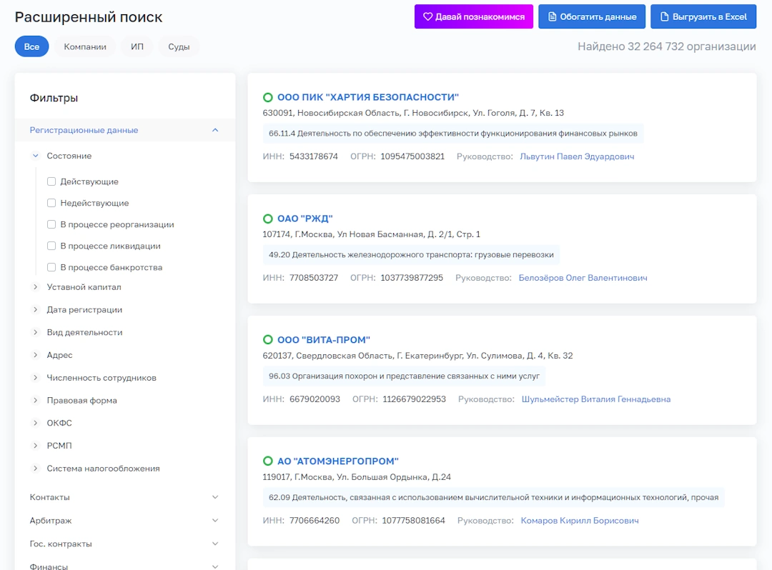- Связи: Интерактивная визуализация аффилированности в виде графа, доступ к историческим связям (бывшие руководители и учредители).
