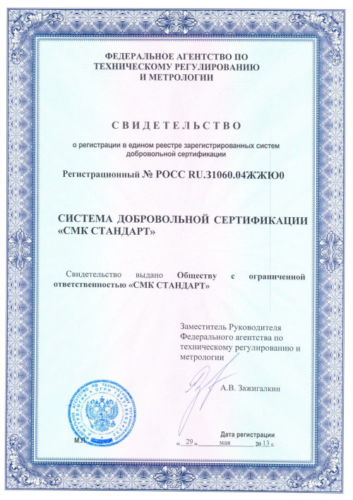 Система добровольной сертификации «СМК СТАНДАРТ» зарегистрирована в Федеральном агентстве по техническому регулированию и метрологии (РОССТАНДАРТ) под № РОСС RU.31060.04ЖЖЮ0. Команда «СМК СТАНДАРТ» оказывает юридическую поддержку на всех этапах сертификации, обеспечивая максимально комфортную и быструю работу.